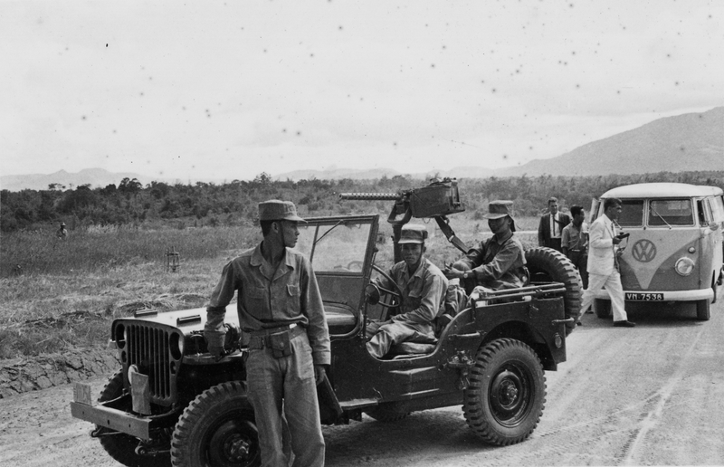 three Army of the Republic of Vietnam (ARVN) soldiers in the foreground with a Volkswagen van in the background, somewhere in South Vietnam. All people pictured are unidentified.
